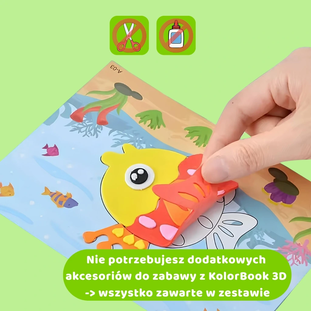 Kolorbook 3D to połączenie dwóch aktywności wspierających rozwój dziecka – z jednej strony przyklejanie przestronnych pianek, a z drugiej kolorowanie.