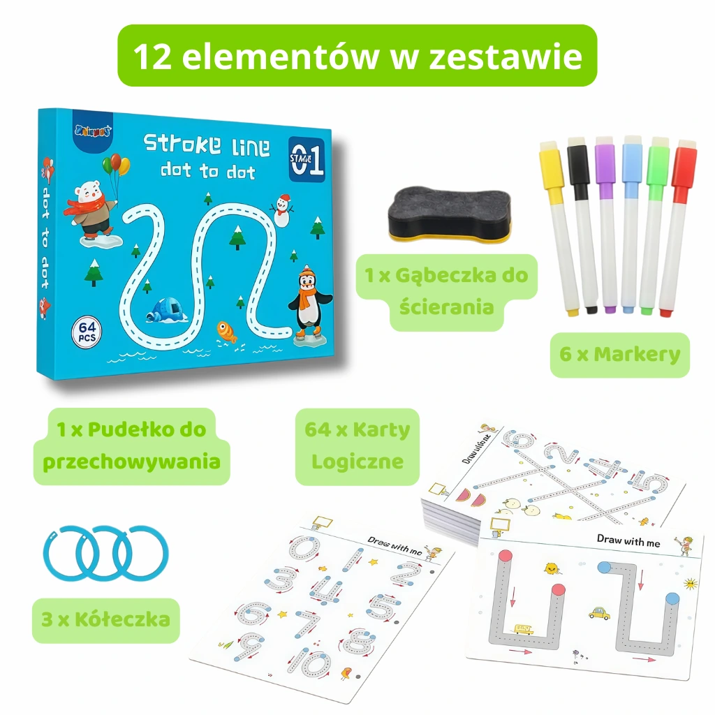 Obserwuj z dumą, jak niepewne ruchy rączki Twojego dziecka zamieniają się w precyzyjne linie i kształty. Dzięki 64 kartom logicznym o różnym stopniu trudności, maluch krok po kroku buduje pewność siebie, przygotowując się do wyzwań w szkolnej ławce.