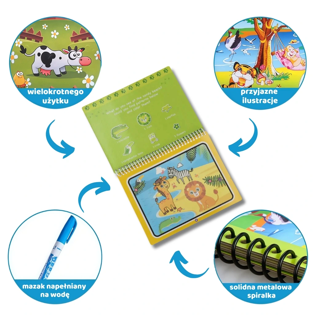 Obserwuj zachwyt w oczach malucha, gdy pod wpływem wody ilustracje z kolorowanki zaczynają ożywać 🥳 Po kilkunastu minutach gdy kartki wyschną wszystkie obrazki znikają, a dziecko może się bawić od nowa.